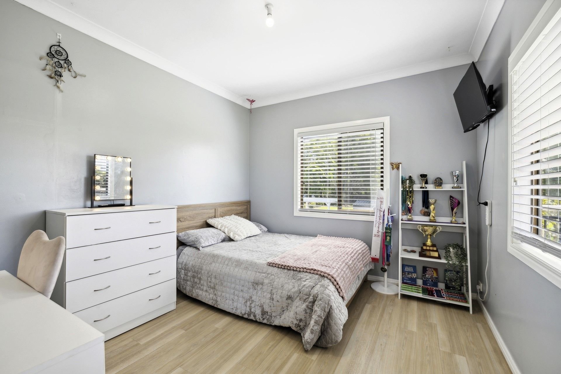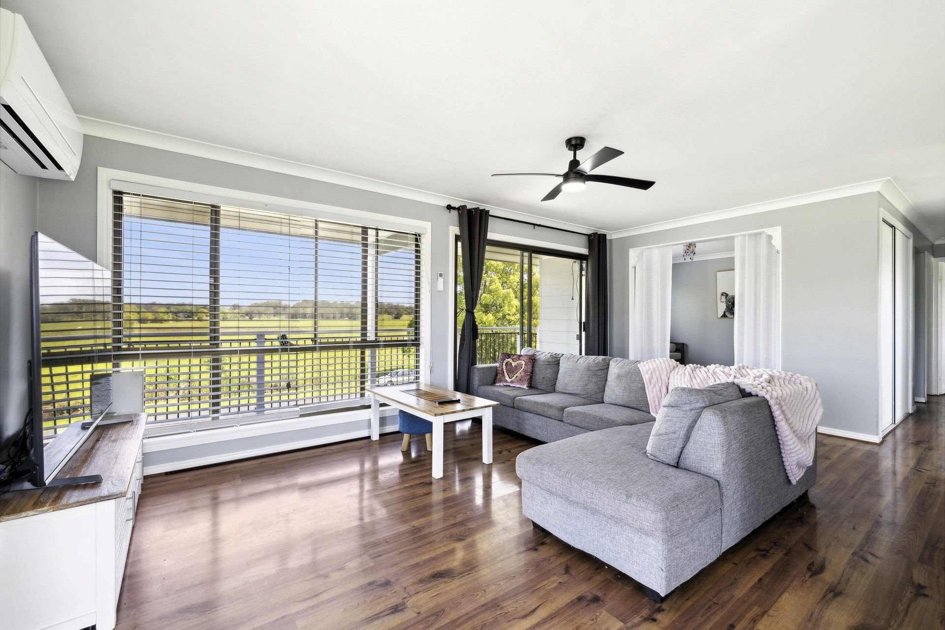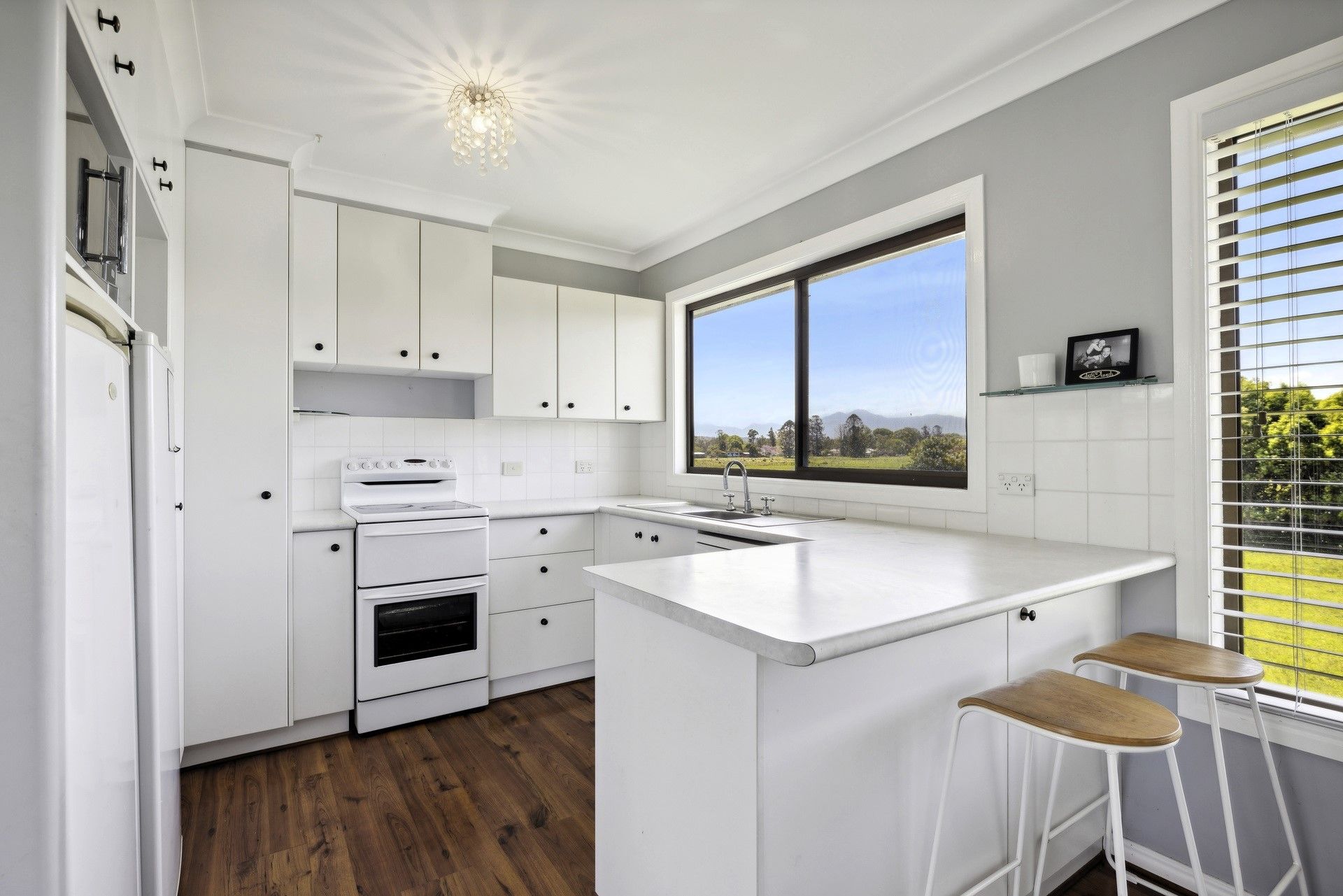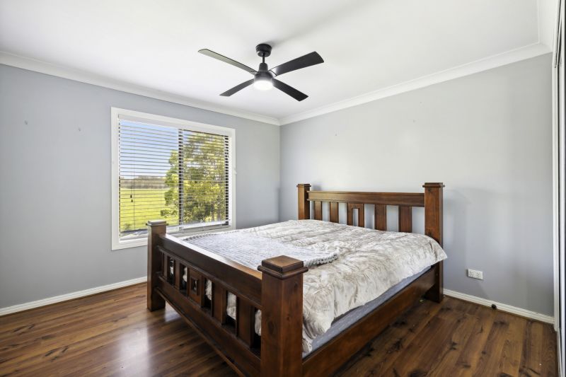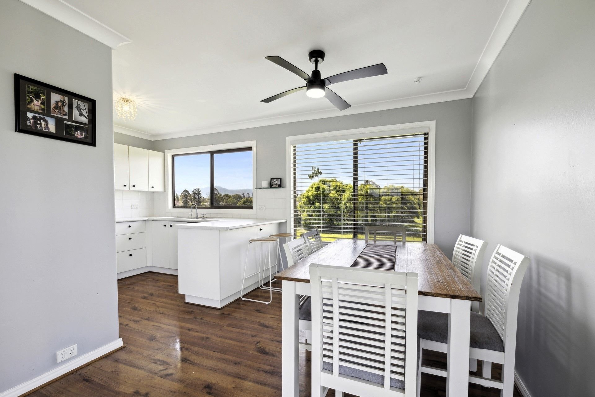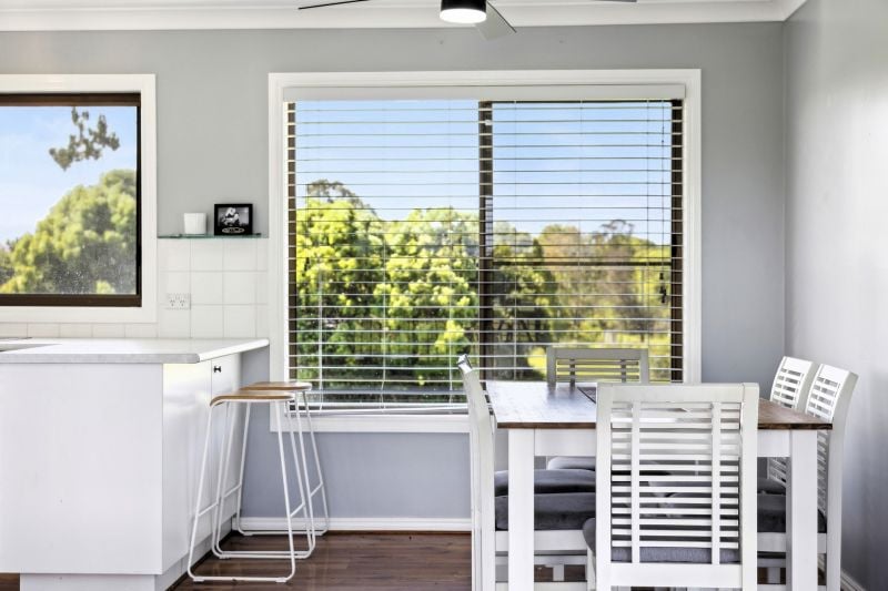 The double storey home is tailored for comfort and flexibility, offering three bedrooms, two upstairs with built-in robes and ceiling fans, and one downstairs, perfect for flexible living. The open-plan design effortlessly blends the kitchen and living areas, creating a comfortable space enhanced by reverse-cycle air conditioning, flowing seamlessly into a formal dining area. A bright, modern kitchen with an upright electric stove and dishwasher is designed with both function and charm, complemented by picturesque views of the surrounding rural scenery.