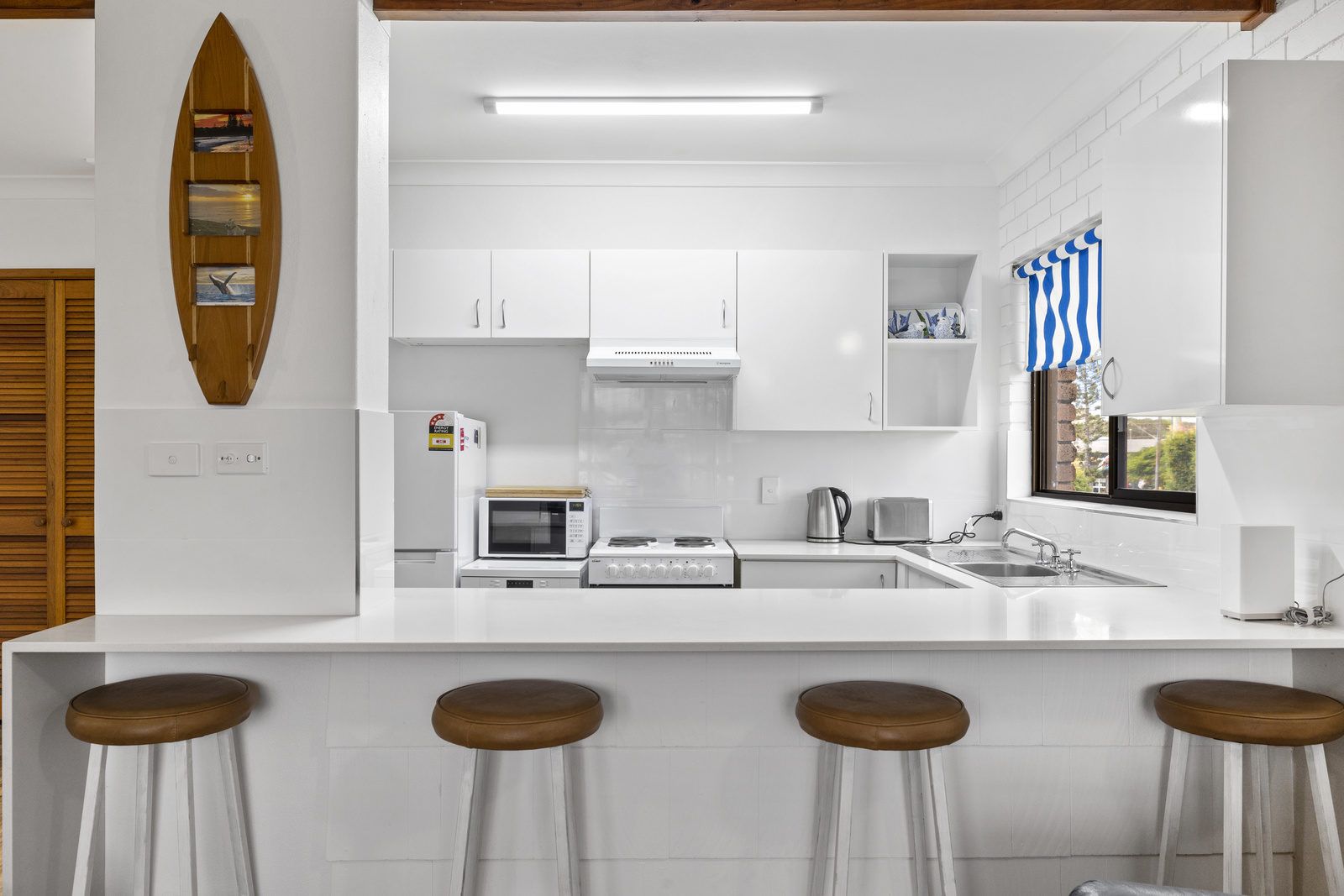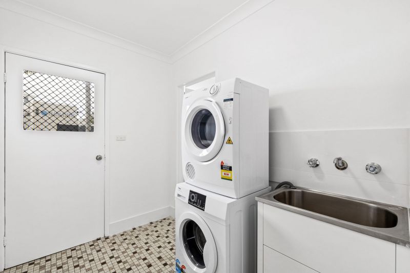 The lounge room features a flat screen tv & six-seater lounge set. The kitchen has everything you need to cater for your own meals on your holiday, with a breakfast bar for you to sit down & enjoy the meals together. Flowing off the kitchen you will find the laundry with a separate toilet & bathroom. Out the back there is a private balcony with a two-seater outdoor setting.