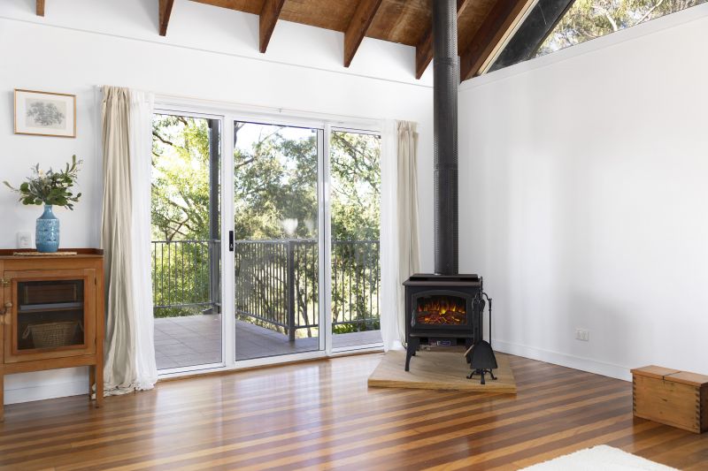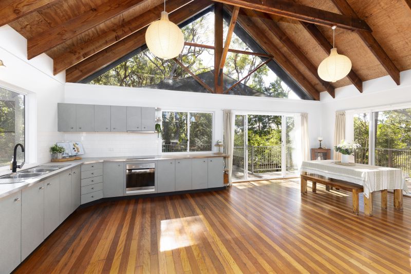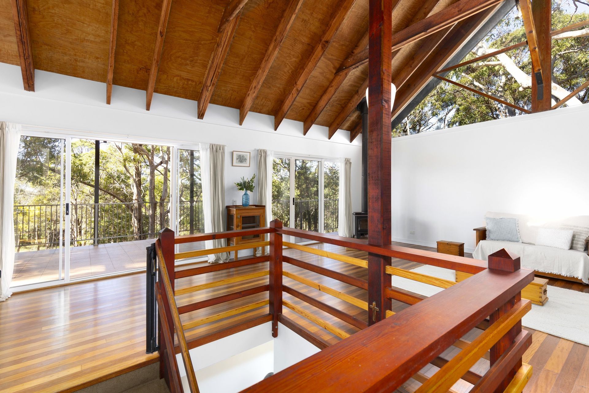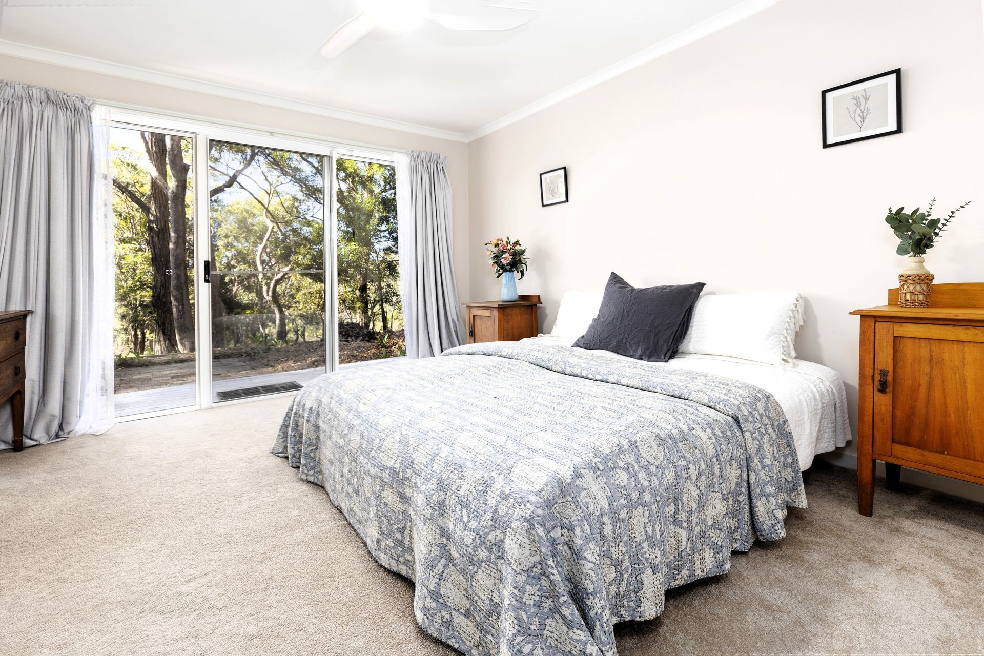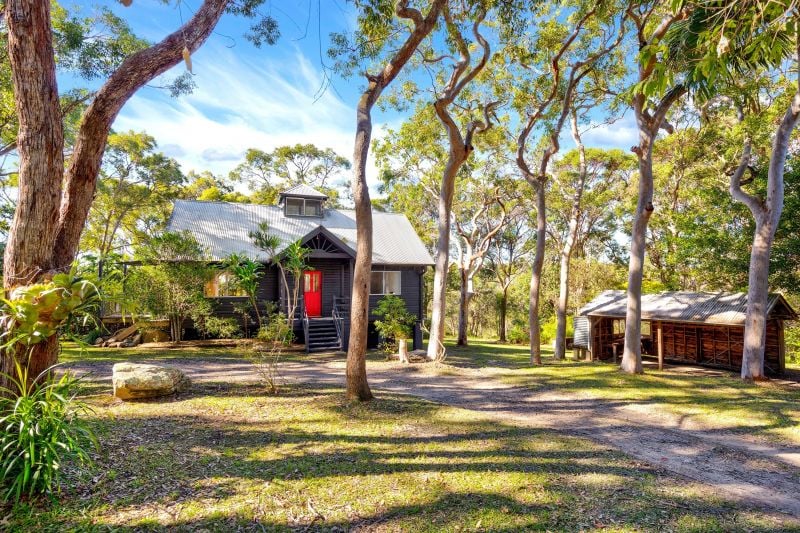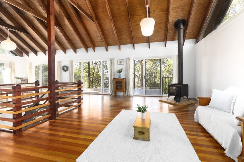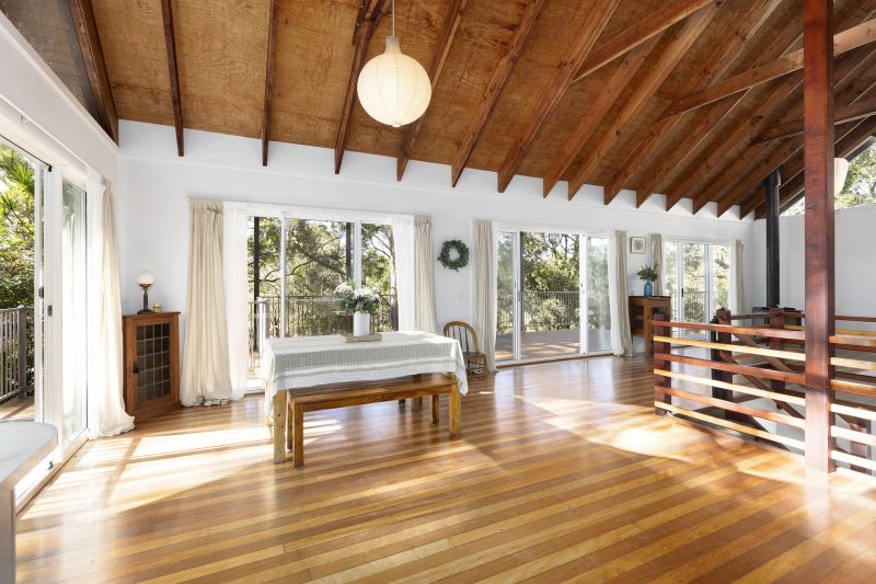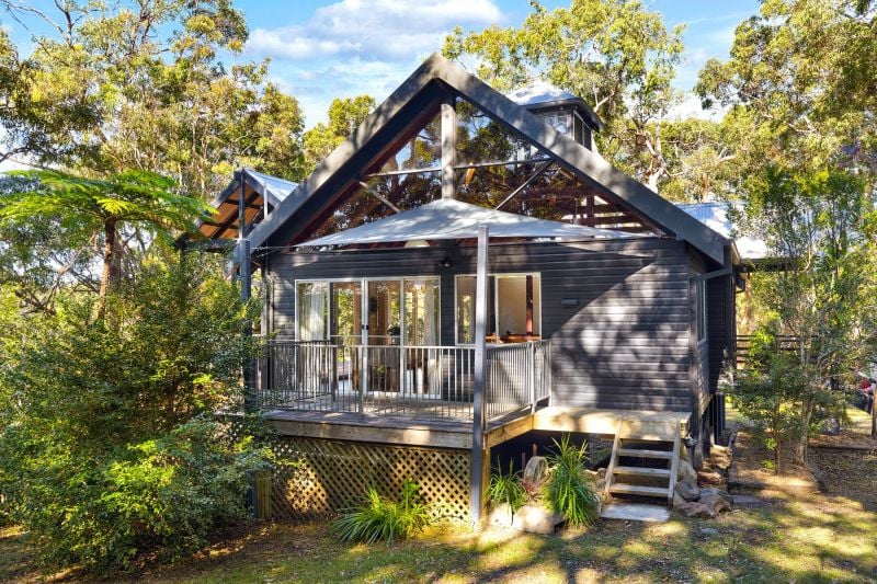 This delightful, character-filled two-bedroom timber cottage, set on a 4,671 sqm block, is designed to inspire the creative-minded or those seeking relaxation and retreat. Step inside to find a harmonious combination of natural elements, featuring glorious high cathedral ceilings and atrium, warm timber floors, and large glass picture windows that invite natural light and the beautiful environment into the home. The open-plan kitchen, dining, and lounge area, complete with a cozy wood fireplace, flows onto spacious decks perfect for enjoying the tranquil grounds.