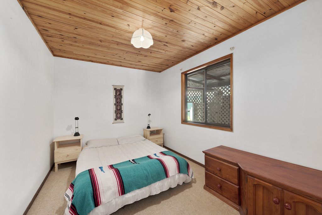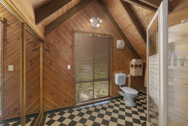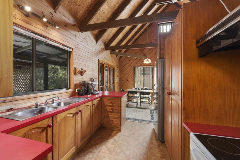 Down stairs you will find the kitchen/dining/lounge with high raked ceilings a real feature of this A-Frame design. The lounge room cedar doors lead out to a great covered entertaining area looking out over crown land.