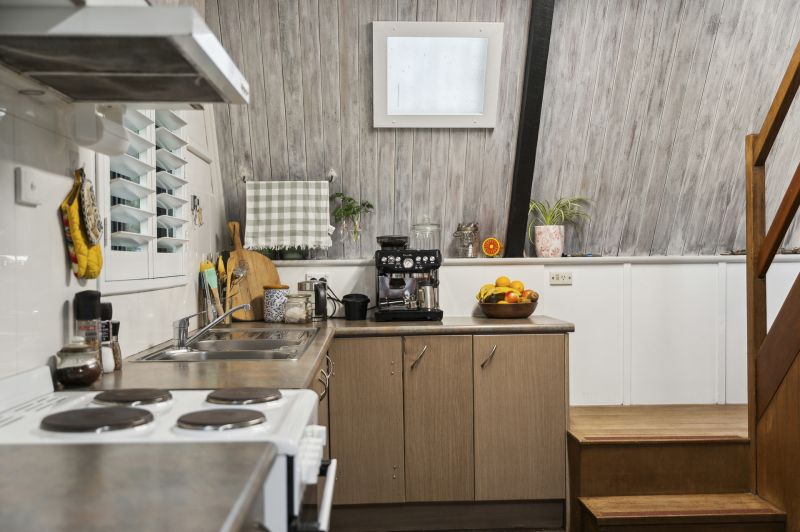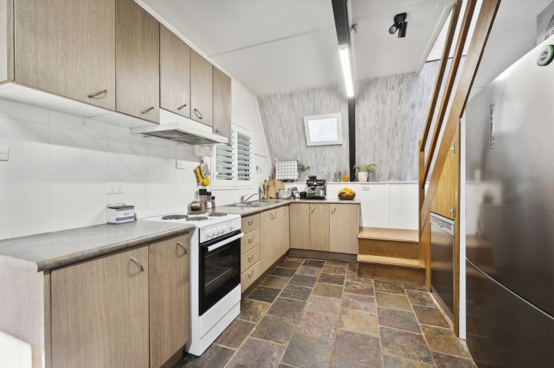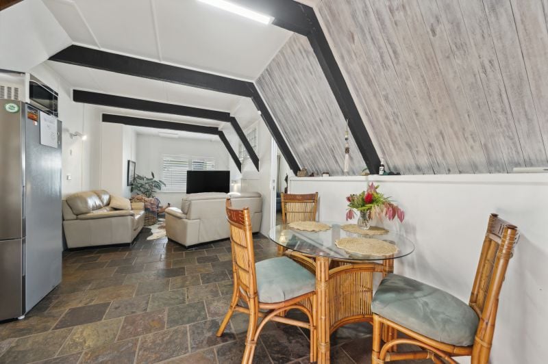 The home embraces coastal living with cool slate flooring throughout the lower level, plantation shutters, 3rd bedroom or office, tiled main bathroom & spacious laundry. The airy kitchen is equipped with electric oven/cooktop & dishwasher and flows freely into the lounge/dining area.