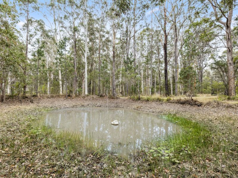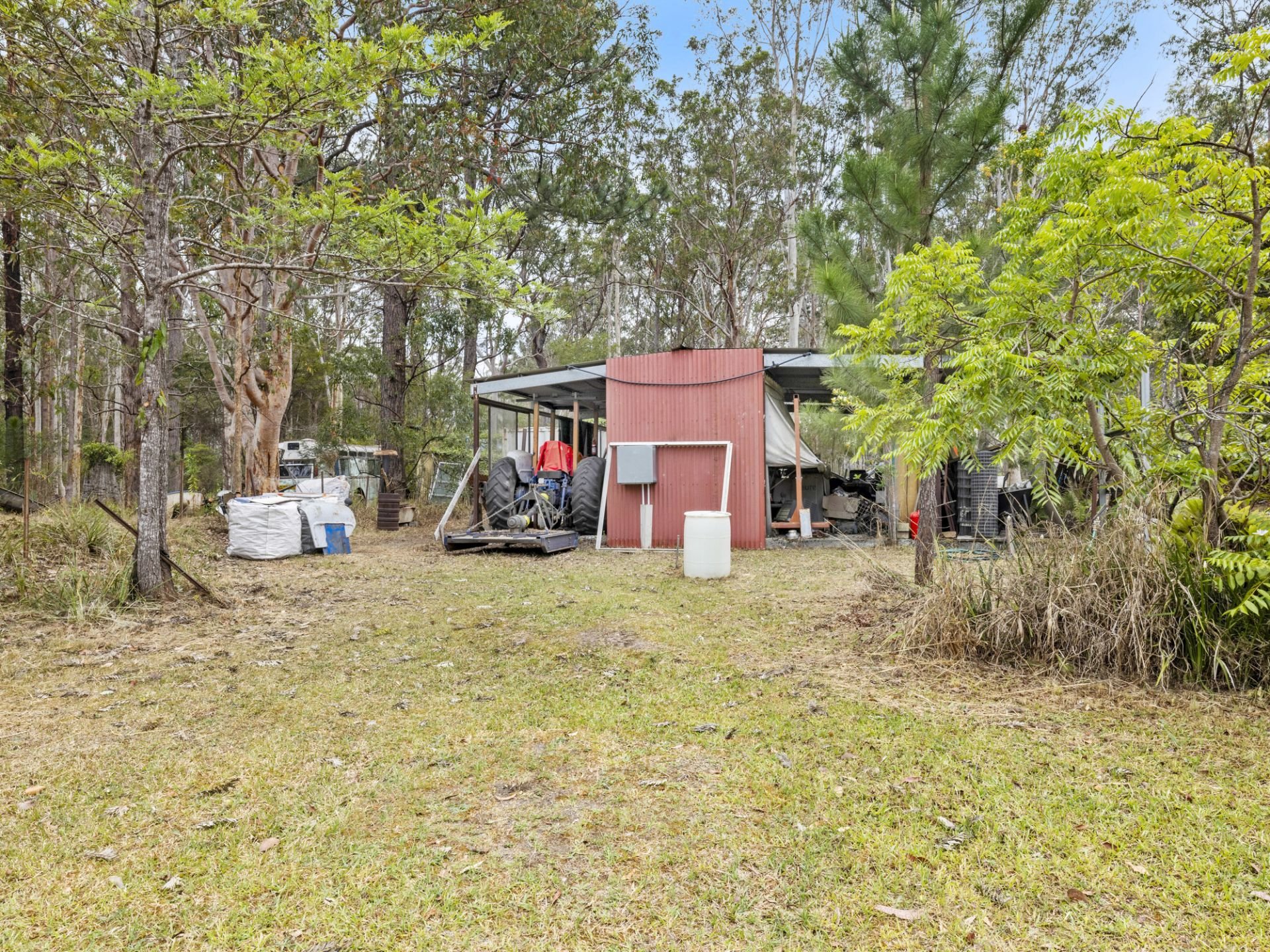 The property features both cleared land with some fences, bushland with established stands of trees including tallowwood, red mahogany, turpentine and bluegum, and is flood free and mainly level with a gentle slope. There is a dam, house water tank, large open workshop area with electricity (approx. 7.5m x 10m), studio/dry storage with carport, and neat and tidy 4-bedroom home with modern inclusions.