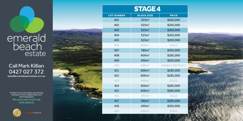 For updated copies of site plan & price list please call or email Mark mark@emeraldbeachestate.com.au.